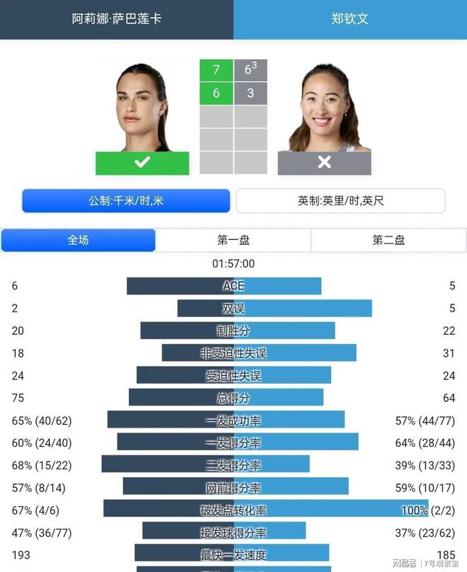 萨巴伦卡先保后破后取得3:2的领先,但关键的第5局郑钦文迅速回应一个回破,双方战成3:3平。此后萨巴伦卡连破带保连赢两局后5:3领先,最终第2盘萨巴伦卡6:3拿下后,大比分2:0战胜郑钦文打进法网女单4强。